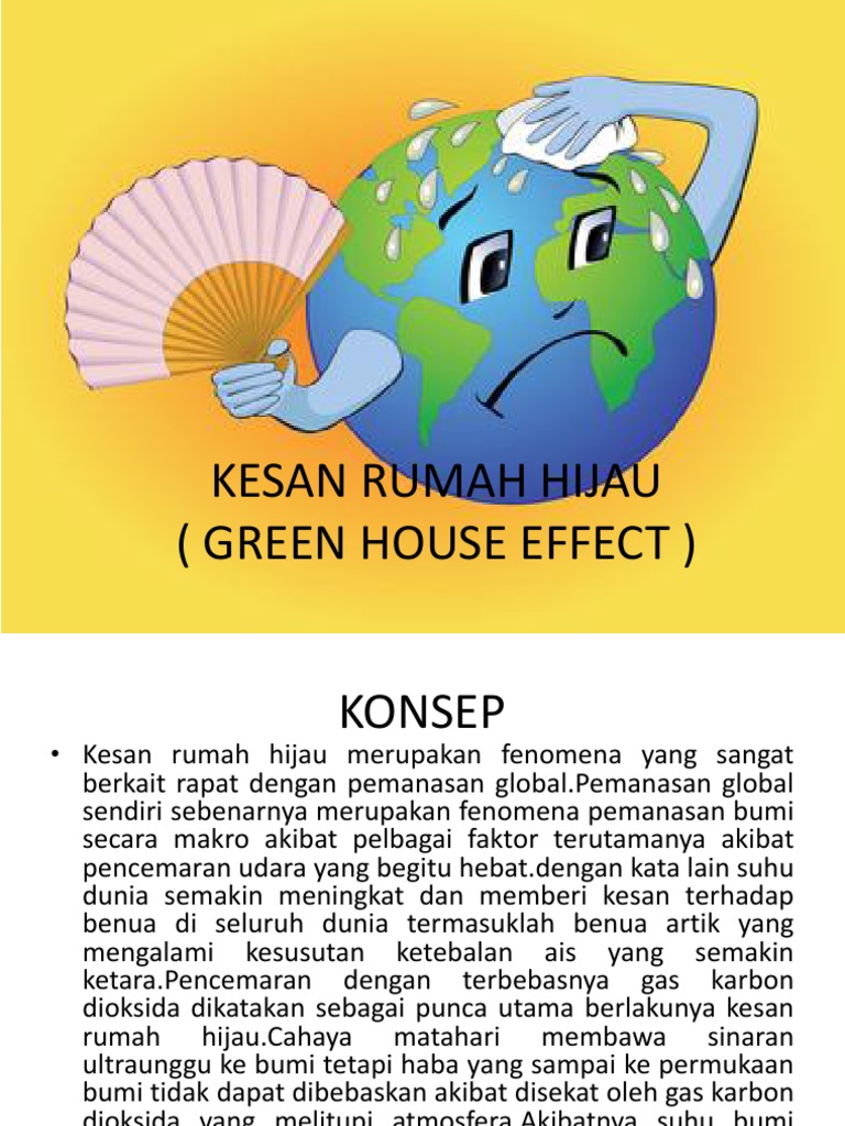 KONSEP KESAN RUMAH HIJAU Merupakan fenomena yang berkait rapat dengan pemanasan global. Gas rumah hijau adalah gas atmosfera yang menyerap dan memancarkan radiasi dalam lingkungan haba inframerahProses ini adalah penyebab utama kesan rumah hijauAntara gas rumah hijau utama yang terdapat dalam atmosfera Bumi adalah wap air karbon dioksida metana nitro oksida dan ozonTanpa gas rumah hijau purata suhu permukaan Bumi barangkalinya. Fenomena fizikal ini termasuk juga fenomena yang berkait dengan iklim dan cuaca.